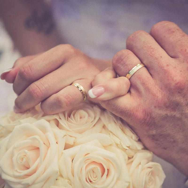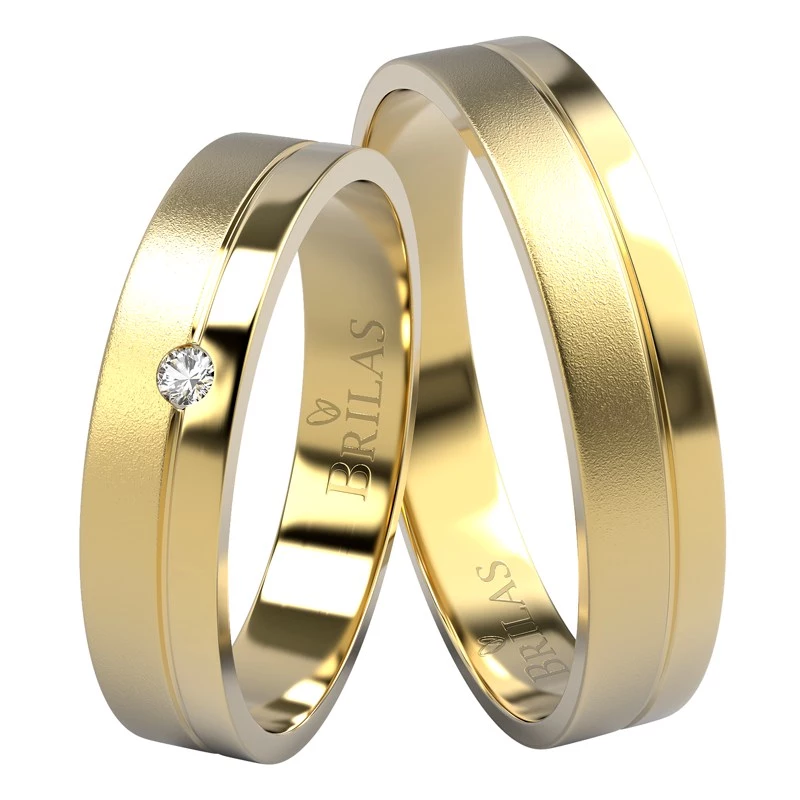 Exkluzívne snubné obrúčky v žltom zlate. Model v kombinácii lesku a matu. Obrúčky sú tvorené dvoma pruhmi, z ktorých horná širšej pruh je matný a spodná pruh je lesklý. Šírka prsteňov je 4 mm. Dámska varianta je v strede osadená jedným zirkónom alebo briliantom veľkosti 1,1 mm. Sbalit popis