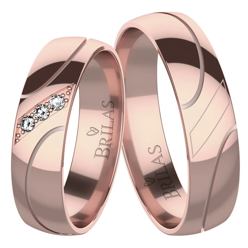 Originálne obrúčky v červenom zlate. Prstene sú zdobené ryhami v tvare polkruhov, ktoré prsteňa dodávajú istú extravaganciu a netradičnosť. Dámsky prsteň je navyše ozdobený tromi kameňmi s veľkosťou 1,3 mm, zasadenými v šikmej línii, kde si dáma môže zvoliť medzi zirkónmi a briliantmi. Prstene majú šírke 5 mm. Sbalit popis