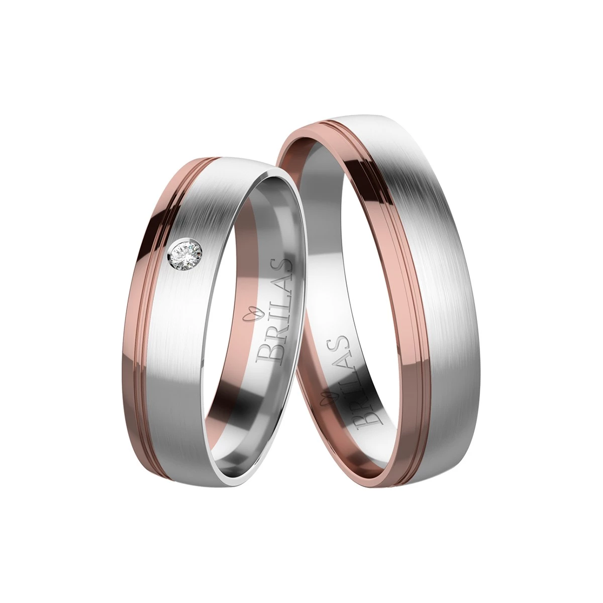 Luxusné snubné obrúčky z kombinovaného zlata o šírke 5 mm. Prstienky sú tvorený kombináciou červeného a bieleho zlata. Užšia časť obrúčky je z lesklého červeného zlata s vyrytými linkami po celom obvode. Širší časť je z bieleho zlata s vodorovným matovaním. Dámsky model je navyše zdobený zirkónom alebo briliantom s veľkosťou 1,5 mm. Sbalit popis